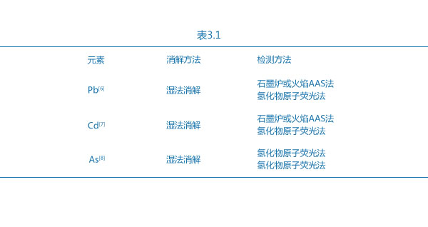 在食品進(jìn)出口中,重金屬是必檢項(xiàng)目,其消解方法和檢測(cè)方法見(jiàn)表3.1。