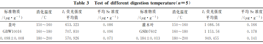 準(zhǔn)確稱(chēng)取2.0g(精確至0.0001g)植物標(biāo)樣茶葉(GBW10016)樣品和灌木葉(GSB07602)樣品各15份,分3組,每組5次重復(fù)稱(chēng)樣,以2.2中HNO3+HClO4(V+V)(8+2)mL混酸比溶液進(jìn)行消化處理,再以不同的消解溫度進(jìn)行消化處理,測(cè)試硒的相對(duì)熒光值,結(jié)果見(jiàn)表3。
