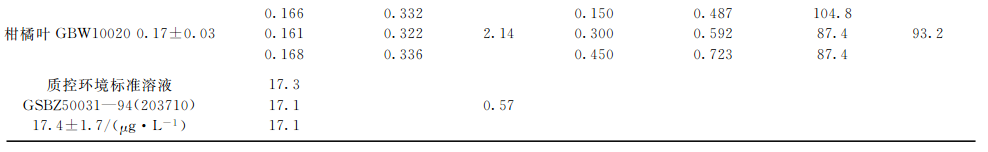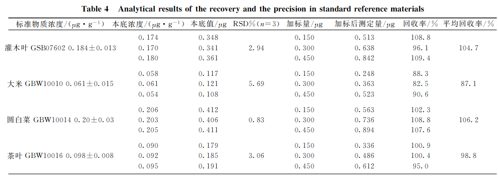 分別選取灌木葉、大米、圓白菜、茶葉和柑橘葉五種植物標(biāo)準(zhǔn)樣品,每種重復(fù)3次準(zhǔn)確稱(chēng)取2.0g(精確至0.0001g),按上述實(shí)驗(yàn)條件進(jìn)行消解,測(cè)定本底值。再對(duì)每種植物標(biāo)樣稱(chēng)取子樣,每種重復(fù)3次準(zhǔn)確稱(chēng)取2.0g(精確至0.0001g),此次每種試樣中分別加入1.0mg?L-1硒標(biāo)準(zhǔn)溶液150,300,450gL,進(jìn)行消解并測(cè)定加標(biāo)后值,同時(shí)測(cè)定硒質(zhì)控環(huán)境標(biāo)準(zhǔn)溶液(GSBZ50031-94(203710)),結(jié)果見(jiàn)表4??梢?jiàn),硒標(biāo)準(zhǔn)加標(biāo)回收率在87.1%~106.2%之間,精密度(n=3)在0.83%~5.69%之間,所測(cè)結(jié)果均與標(biāo)準(zhǔn)物質(zhì)的參考值吻合,完全達(dá)到分析要求。