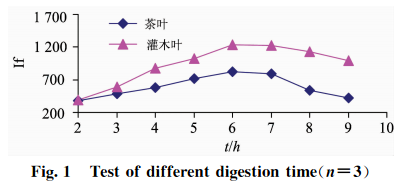 準(zhǔn)確稱(chēng)取2.0g(精確至0.0001g)植物標(biāo)樣茶葉(GBW10016)樣品和灌木葉(GSB07602)樣品各24份,分8組,每組3次重復(fù)稱(chēng)樣,以2.2中HNO3+HClO4(V+V)(8+2)mL混酸比溶液,以表3中的160~180C為消化溫度,分別設(shè)定8組消化時(shí)間為2,3,4,5,6,7,8,9h,測(cè)試硒的相對(duì)熒光值,結(jié)果見(jiàn)圖1。