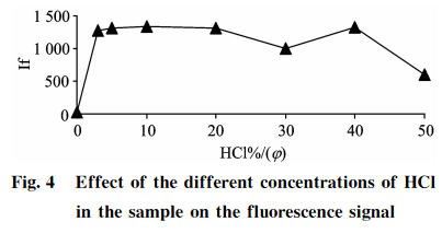 品消化過(guò)程的酸度確保了Se+還原成Se+,上機(jī)測(cè)試前樣品經(jīng)稀釋后制備液酸度也會(huì)影響硒的測(cè)定結(jié)果。分別吸取100gg?L-標(biāo)準(zhǔn)應(yīng)用液5.0mL于7個(gè)50mL的具塞比色管中,分別加入0.0,1.5,2.5,5.0,10.0,15.0,20.025,0mL濃HCl,用純水稀釋定容至刻度,用以制備不同酸度的10gg?L硒標(biāo)準(zhǔn)溶液,以2.4中的載流和還原劑濃度進(jìn)行上機(jī)測(cè)定,結(jié)果見(jiàn)圖4??芍?扣除空白后,HCl(g)在3%~20%范圍內(nèi),10gg?L-1硒標(biāo)準(zhǔn)溶液具有較強(qiáng)且穩(wěn)定的熒光強(qiáng)度;當(dāng)樣品HCl(q)>20%時(shí),硒熒光值受到抑制且不穩(wěn)定,考慮到樣品酸度的提高有利于硒的還原,同時(shí)可以減少共存元素的干擾,故本方法選用15%HCl(g)酸度作為樣品和標(biāo)準(zhǔn)溶液上機(jī)測(cè)試時(shí)制備液的酸度,才能保證測(cè)量的穩(wěn)定性和一致性。