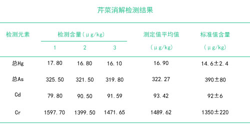 本試驗采用的石墨消解儀硝酸濕法消解方式,僅需1次前處理方法,可以同時檢測鎘、鉻、汞和砷4種重金屬元素,操作簡便,試劑耗材消耗量少,石墨消解儀消解芹菜,節(jié)約了成本,具有批處理量大且無需實驗人員值守的優(yōu)點,安全性系數(shù)高,一般性實驗室均可采用。本實驗只用硝酸硝解樣品,對樣品進行預消解處理,安全系數(shù)高,樣品空白成分簡單,空白值低。